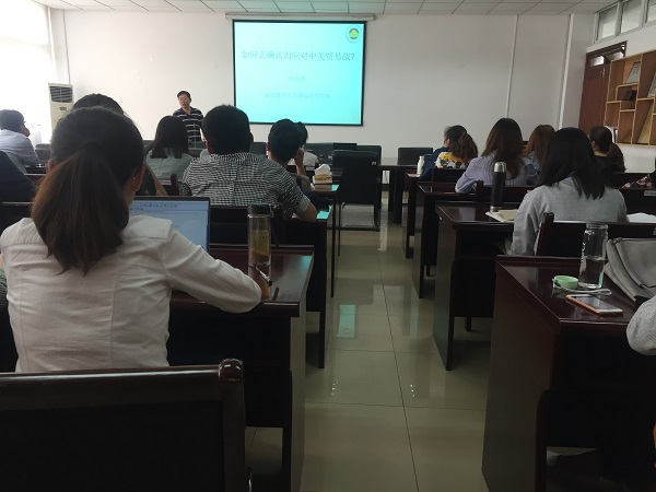 2018-05-10色色动漫 举办第16期青年学者论坛——我校副教授杜运苏做讲述“如何正确认识及应对中美贸易战”