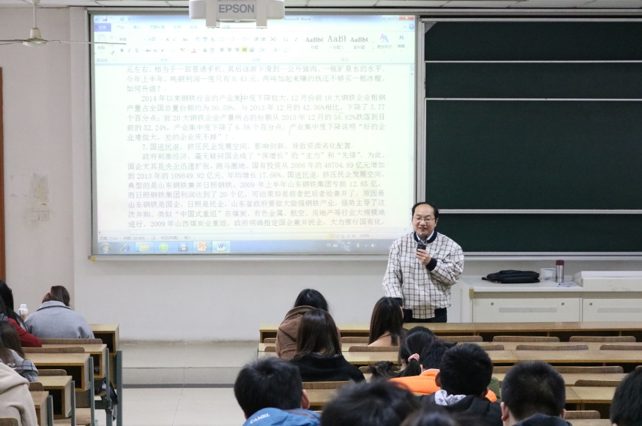 张玉和副教授首先点明“十三五”规划GDP数据的由来,并分析GDP近年来的增长速度变化。通过对计算经济增长数据的研究,理性指出经济增长同时付出的代价,由此评述国家经济发展的相关政策。以发改委批下大量项目为例,他提到产能过剩加剧、大量投资浪费的现象,分析了投资效益低下,坏账迅速增加的后果。讲到地方政府债务急剧暴涨导致债务危机形成的现象,他强调虚拟经济发展使得资本加速积聚脱实向虚。讲座中,张教授与同学们就经济发展对策上如何正确引导政府和投资主导的问题进行了讨论,他分析:不能为了追求经济增长而逐渐恶化贸易环境,投机致富只会败坏社会风气,国进民退只会挤压民企发展空间影响创新和劣化资源配置。