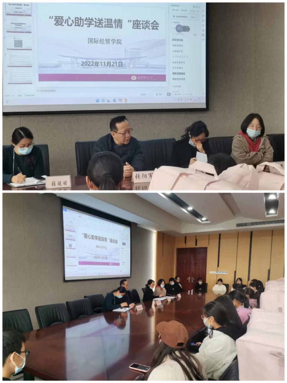 在德经楼308会议室组织开展“爱心助学送温情”座谈会。学院党委书记张阳军、党委副书记季霞、2022级辅导员张朋朋、刘紫月以及部分新生代表参与了此次座谈会。