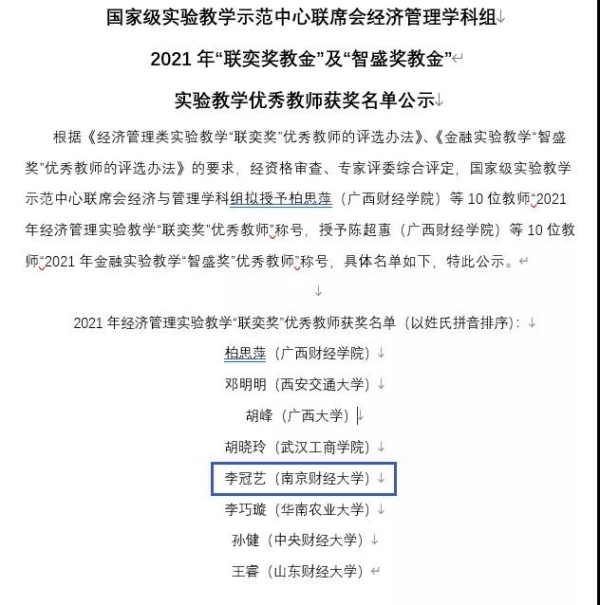 李冠艺老师荣获“2021年经济管理实验教学‘联奕奖’优秀教师”称号!