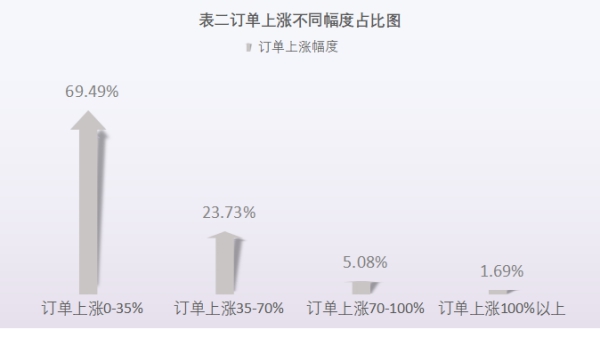 研究发现零售批发业大环境下整体订单量及在线咨询量呈下滑趋势,但其中存在反向变动的情况,这主要集中在美妆/日化、鞋包/配饰、速食百货、文教图书以及个人防护等品类。数据显示69.49%的商家的订单量较去年同期增加35%以下,23.73%的商家订单量上涨35%-70%,5.08%商家订单量上涨75%-100%,1.69%商家订单量上涨超过100%。其中,特别地,经营个人防护类商品的商家近90天订单交易数量均较去年同期上涨75%以上。但是工业制成品、机械钢铁以及化工业等产品则处于滞销的状态。这表明在疫情的冲击下,对主营电商商采的批发零售业企业带来挑战的同时也带来了机遇。