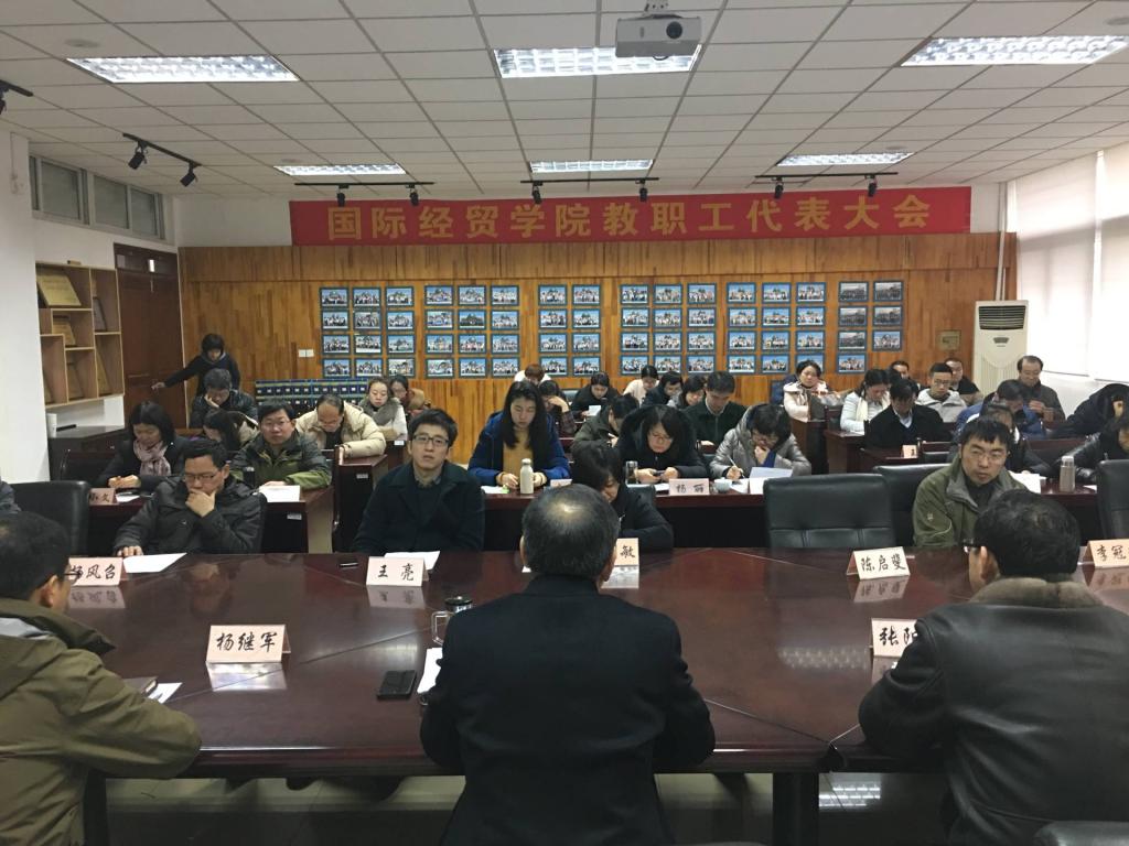 党风廉政建设制度实施细则》,建立健全“三重一大”事项集体决议制度和院务公开制度,增强工作透明度,把控廉政风险,落实防控措施,责任到人。其次,学院以优化人才培养方案、创新才培养模式为基础,以国际经济与贸易专业实验班为抓手,设计分层教学、分流培养、分类成才的培养体系。同时,学院还以团学活动创新为基础,充分发挥第二课堂的辐射作用,通过启动短期国际游学项目等提升人才培养质量。第三,定期组织在职教师学习、培训和研讨等,每周开展教师教学公开赛,致力于提升学院教师的科研能力与教学水平。第四,目前学院的学术梯队的知识结构、年龄结构以及专业技术职务结构较为合理,形成了一支与学校研究生教育规模发展相匹配、整体学术实力较强的研究生导师队伍。第五,学院围绕着应用经济学博士点建设工作,依托三个教学科研重大项目,重点打造了三个科研团队:服务经济、开放经济和智慧商务,塑造了中国服务经济发展论坛(会议品牌)和南财国贸紫金青年学者论坛(讲座品牌),提升了学院的科研工作成效。宣院长在总结之后也指出了2019年总体工作的方向:第一,继续优化师资队伍结构;第二,继续加强研究生的科研创新能力;第三,继续推进本科生的继续深造工作;第四,加强学生培养模式与实践的联系。最后,宣院长对2019年的总体工作做了部署。