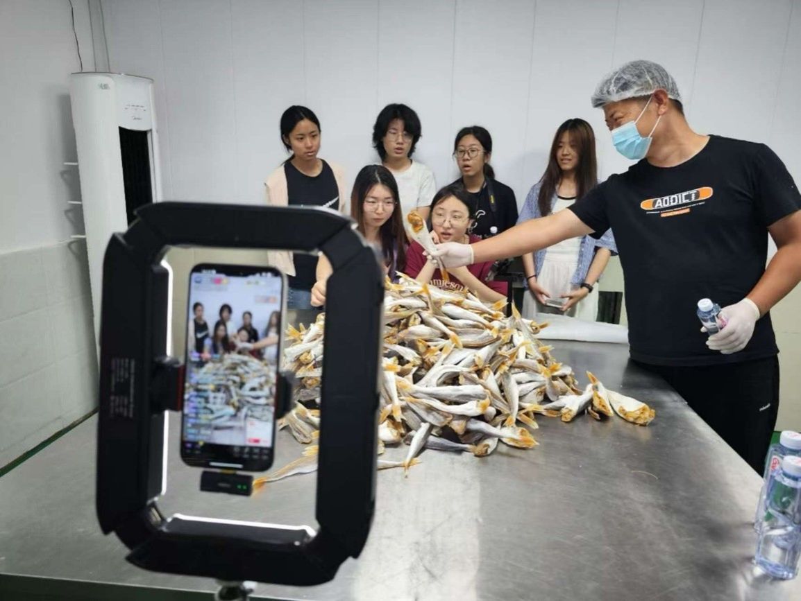 为了深入调研电商助农模式,团队成员与当地农产品带货网红王大来进行交流访谈,就其抖音账号运营模式、直播带货品类、目标客户、同赛道竞争压力等方面开展深入交流。此外,团队成员纷纷加入进入直播间协助售卖当地农产品,同学们的热情介绍为直播间带来了可观的流量和营业额。李松林老师表示,村里将通过厂房、农副产品加工设备租赁等方式,扩大网红王大来生产规模,充分发挥其网红效应,依托抖音等以电商平台拓宽销售渠道,实现村集体和村民的双向奔赴。