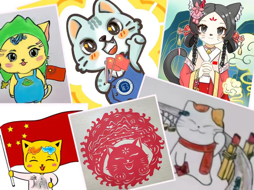 入围的同学们以独特的画风,新颖的创意,创作出了各式各样的国小猫形象——有以国风元素为主体的拟“人”版国小猫形象:吉祥物身穿汉服,以大红大绿作为作品的主色调,代指;“祖国”与“山河”,有以招财猫为原型的国小猫形象,意指招财进宝,吉祥如意:以中国地标性建筑南京长江大桥作为画面背景,寓意连通过去与未来,风调雨顺,国泰民安;更有形式创新的剪纸版国小猫形象,在问及创作理念时,国贸2104班的周梦婷表示:“整幅作品以太阳的外形呈现,寓意着祖国母亲长盛久安,简练的线条勾勒出连绵起伏的山峦,云雾缭绕,象征着祖国的大好河山,作品下半部分由国小猫将拱桥扛起,代表着希望同学们都能成为对社会有贡献的人,做国家的栋梁。”