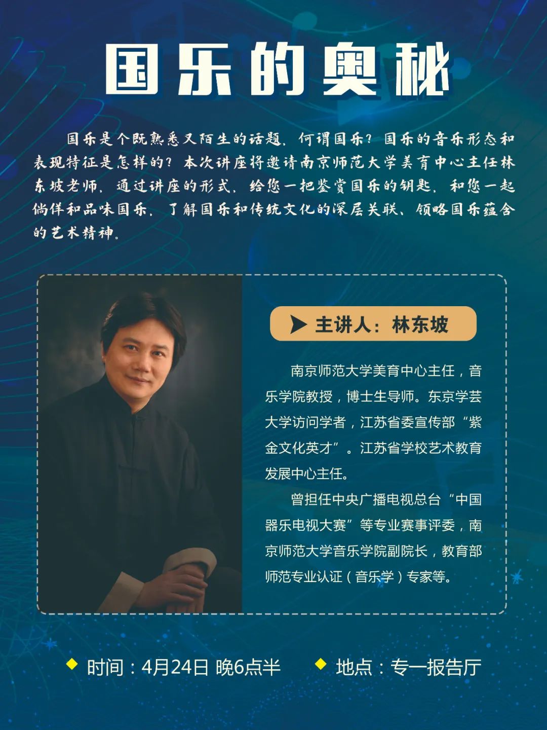 国乐是个既熟悉又陌生的话题,何谓国乐?国乐的音乐形态和表现特征是怎样的?本次讲座将邀请南京师范大学美育中心主任林东坡老师,通过讲座的形式,给您一把鉴赏国乐的钥匙,和您一起倘佯和品味国乐,了解国乐和传统文化的深层关联、领略国乐蕴含的艺术精神。