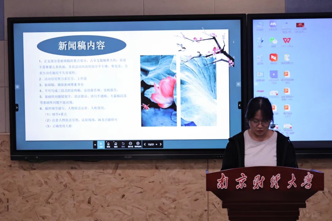 分团委副书记李玉桐进对举办活动的流程进行了细致讲解。她分别从前期策划、现场照片拍摄、新闻稿撰写以及活动总结四个方面进行了说明,并结合过往优秀案例帮助学生骨干更加直观、形象地理解“四大件”的撰写要点、技巧和注意事项,助力学生会骨干进一步提高自身素质和工作效率。