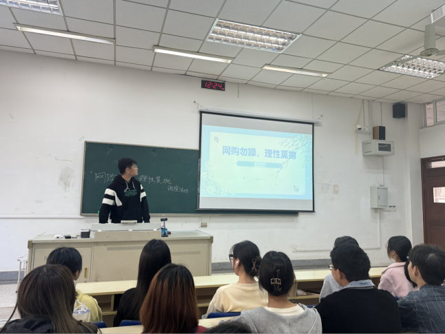 接着,蒋佳成同学从理性消费的重要性入手,告诫同学们狂欢之余,勿忘理性。呼吁同学们在购物时要做到长期规划与短期满足相平衡,消费后要进行满意度与负债管理,防止过度消费,减少后悔度,让消费成为提升生活的助力而非负担。除此之外,他还从商家常用的优惠券和促销陷阱角度,例举了真假优惠券、叠加优惠虚抬价格及预售和秒杀的风险等问题。助力同学们避免调入价格陷阱而冲动消费,提升购物效率,保持理性消费。在售后服务保障方面,他向同学们介绍了退换货的政策与流程以及售后问题的处理技巧。大学生需明确退换规则,快速响应售后问题,选择有质检保障的商品,确保购物无忧,享受真正实惠,捍卫自身权益。
