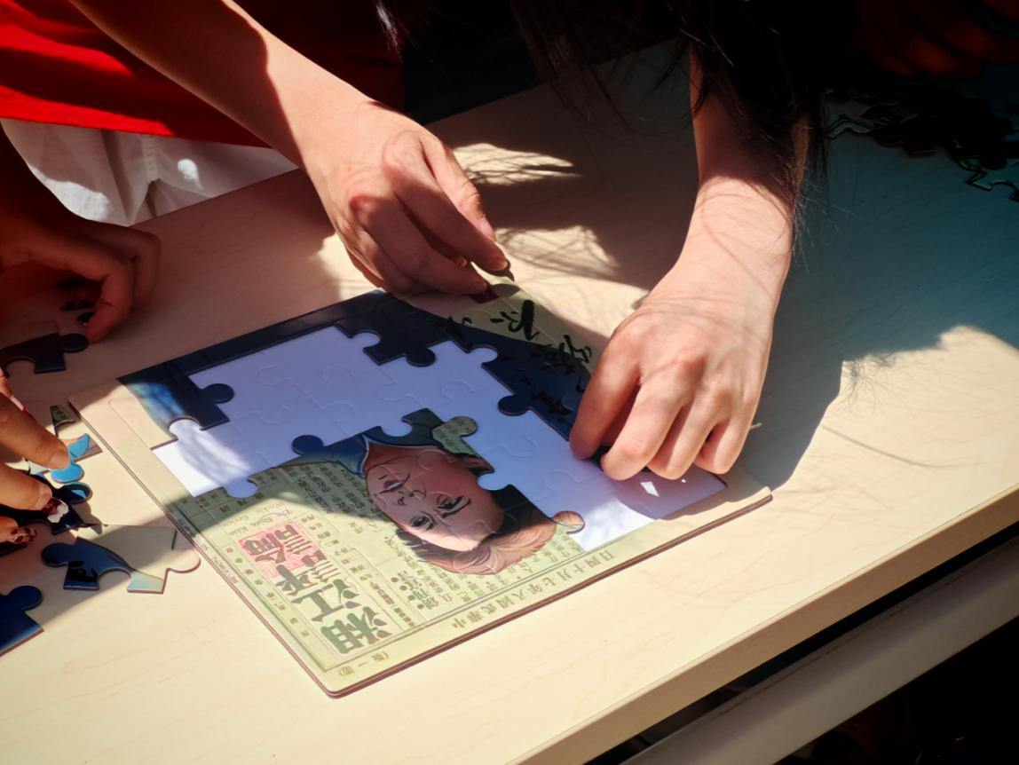 场内氛围迅速升温,活动进入了“青春拼图”环节。同学们争分夺秒地拼凑印有毛泽东、李大钊、陈独秀、鲁迅、蔡元培五位“新青年”代表人物形象的拼图。每一片拼块的拼接,都宛如在拼凑那个觉醒年代的精神版图。各小组默契配合,将散乱的拼图逐渐拼凑完整。同学们在这场智力与速度的较量中,以拼图的形式,生动而深刻地缅怀五四先驱,更是对五四精神传承的具象化表达。