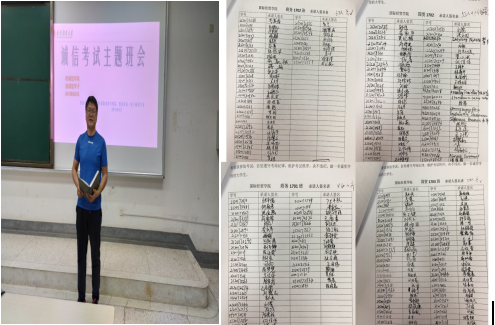 班会上,2017级辅导员向同学们明确了考场的规则以及作弊的处理类型。在此基础上让同学们围绕对考纪考风的认识,用怎样的心态迎接期末考试和了解考场违纪后的相关感悟开展讨论。最后带领大家签署诚信考试承诺书。