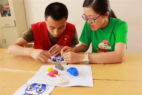 活动伊始,志愿者们准备了丰富的纸浆画材料和详细的技巧教学,带领大家迅速进入了纸浆画制作的学习状态。随着不同颜色的纸浆被戳进相应的颜色区内,一个个比划着手语活灵活现的超级英雄出现在大家眼前。“老师,你快看我做的画啊,我觉得我好棒啊能做出这么好看的东西!”张新南同学一边克服发音的障碍一边举着纸浆画对志愿者激动地说。绘制完自己的“超级英雄”,同学们都主动拿起画板与志愿者们合影。