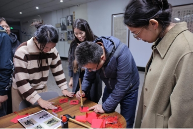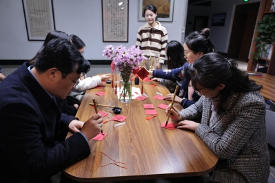 本次活动依托中华传统文化中的书法技艺,分为“写字”和“传意”两个环节。毛笔书法的书写过程需要专注和耐心,在“写字”环节,学院师生使用毛笔在共同方格红色纸张上书写“廉”和“德”字,不仅促进了彼此之间的交流,更增进了对廉德的内涵意义理解和认同,感受廉德文化的力量,进而潜移默化地树立了对廉洁和道德的追求和信仰。在“传意”环节,学院师生将书写的“廉”和“德”字作品用红色的流苏悬挂,传意喜庆祥和、祝福美好,让更多的人从欣赏到感悟至推崇。