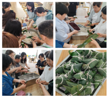 随后,在食堂师傅娴熟如行云流水的示范指导下,师生们一起动手包粽。“掌心空、手指松、糯米实、叶子牢”,大家边摸索边体会,不时还交流一下各种粽子包法的不同。翻卷粽叶、轻放食材、反复裹紧、缠牢棉绳......,每一个的粽子成形,都迎来了成功的欢呼和品评的惊叹。摇头点头间,喜悦逐渐爬上了眉梢。现场忙碌欢乐的景象,温馨而热烈。