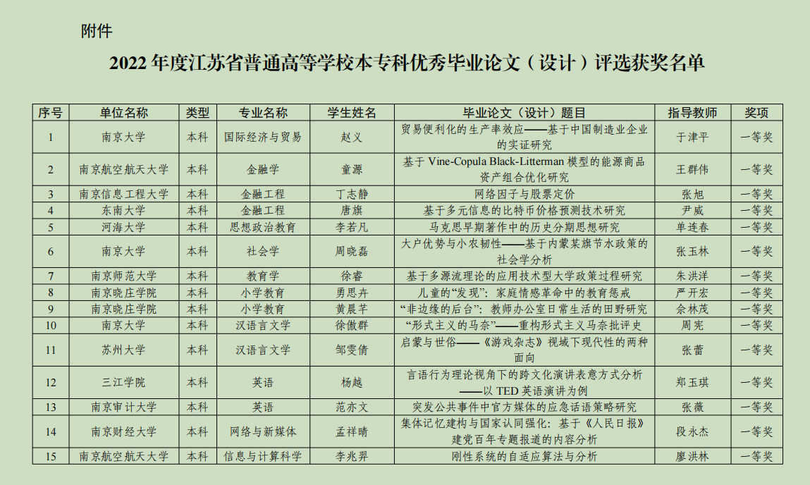 近日,江苏省教育厅发布了关于《2022年度江苏省普通高等学校优秀本专科毕业论文(设计)评定结果公示》,色色动漫