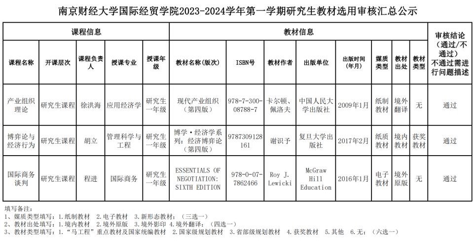 2023-2024学年第一学期所有选用的研究生教材进行政治性和学术性审核,审核结果公示如下。公示期对结果如有异议,请与学院研究生培养办公室联系,地址:德经楼334,电话:86718230。