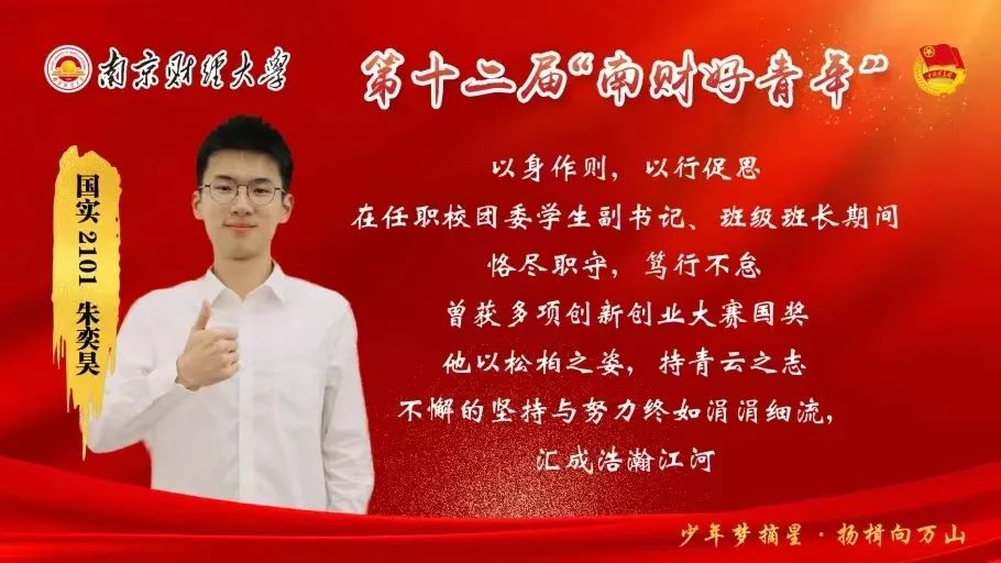 优秀学子国实2101朱奕昊、国实2001郑孔迪、国贸2003苏一舟荣获十强,并一举夺得了“南财好青年”称号。